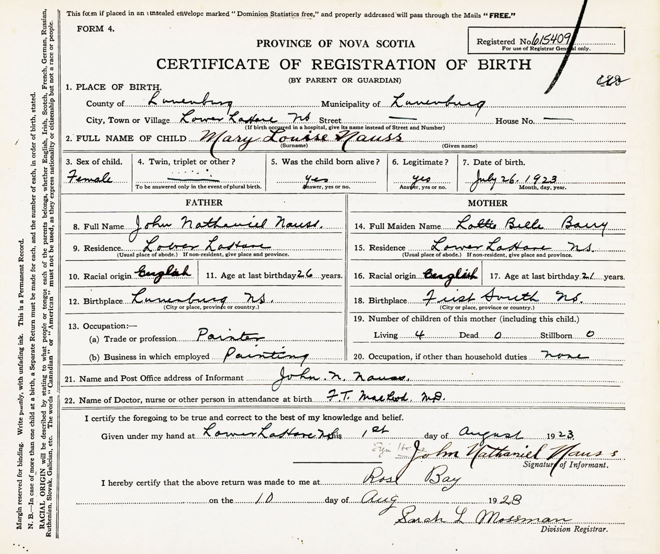 Female Birth Registration: Year: 1923 number: 61500409