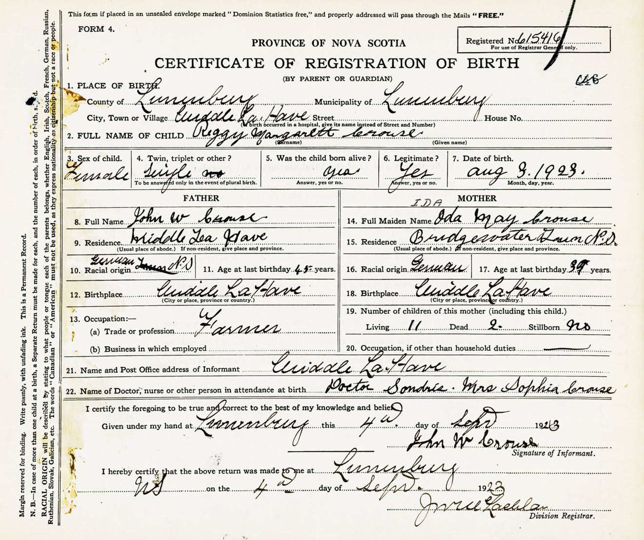 Female Birth Registration: Year: 1923 number: 61500416