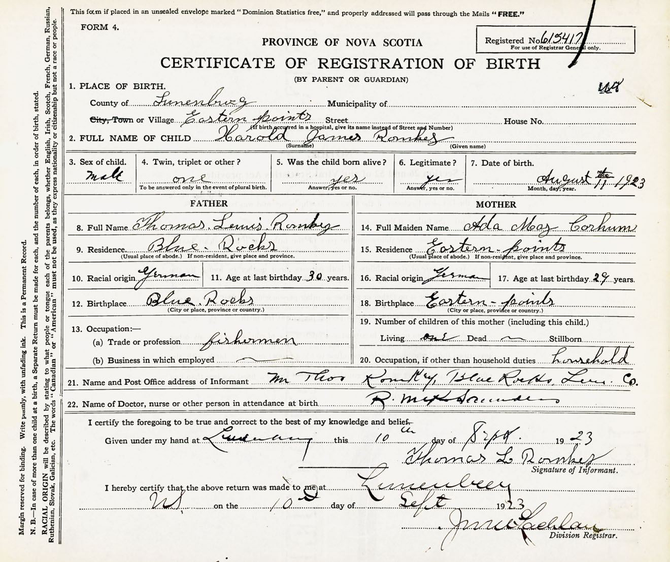 Male Birth Registration: Year: 1923 number: 61500417