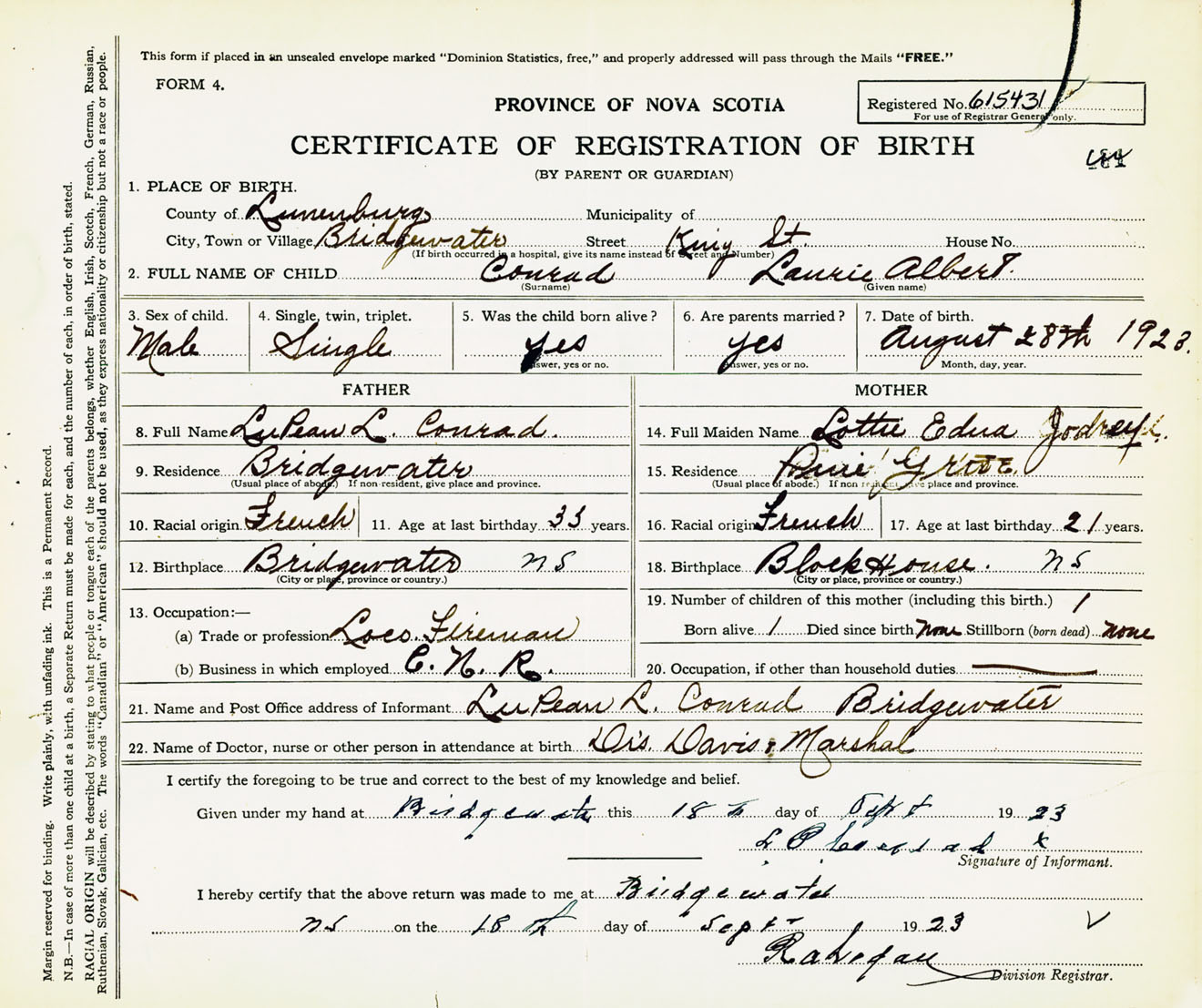 Male Birth Registration: Year: 1923 number: 61500431