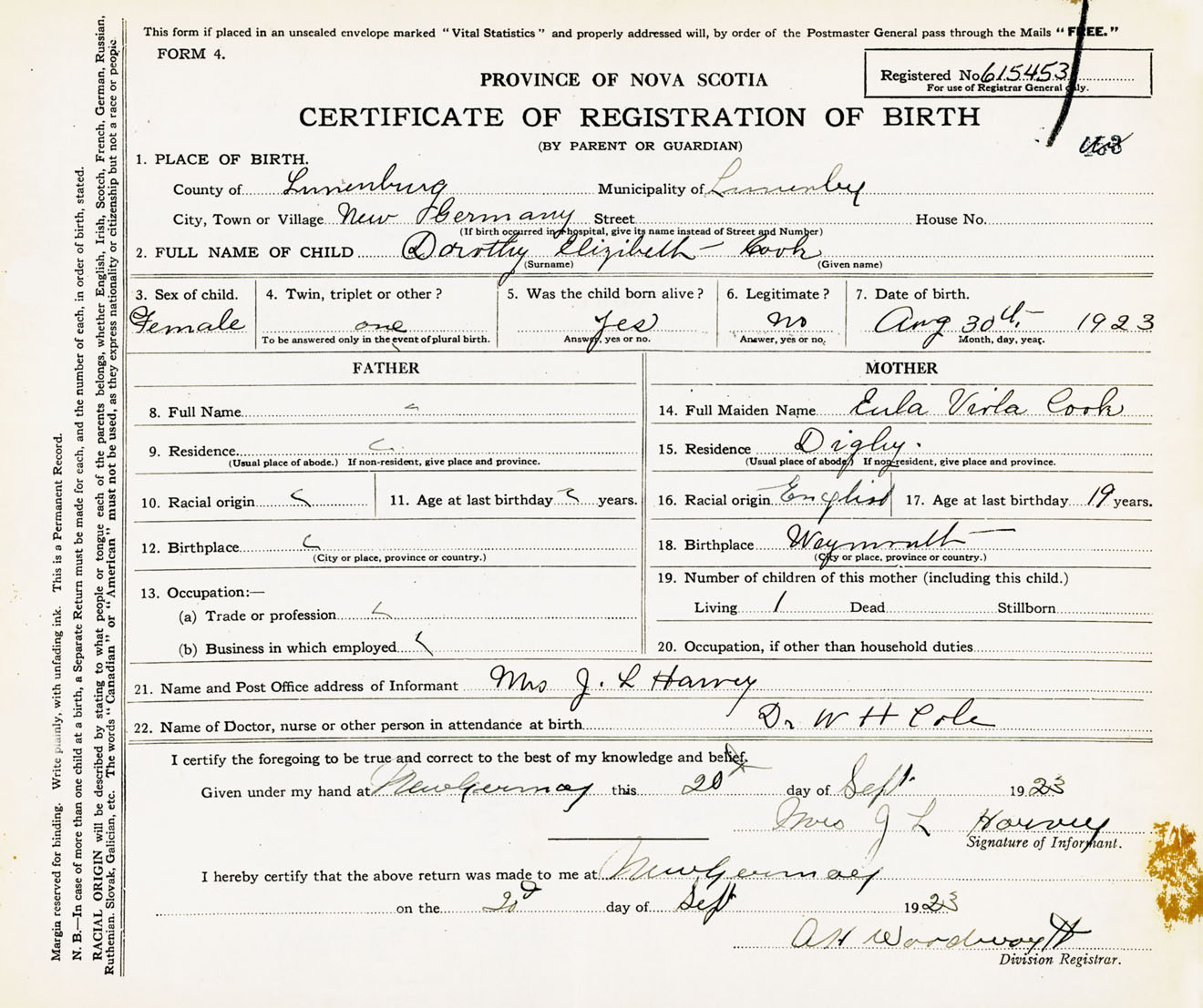Female Birth Registration: Year: 1923 number: 61500453