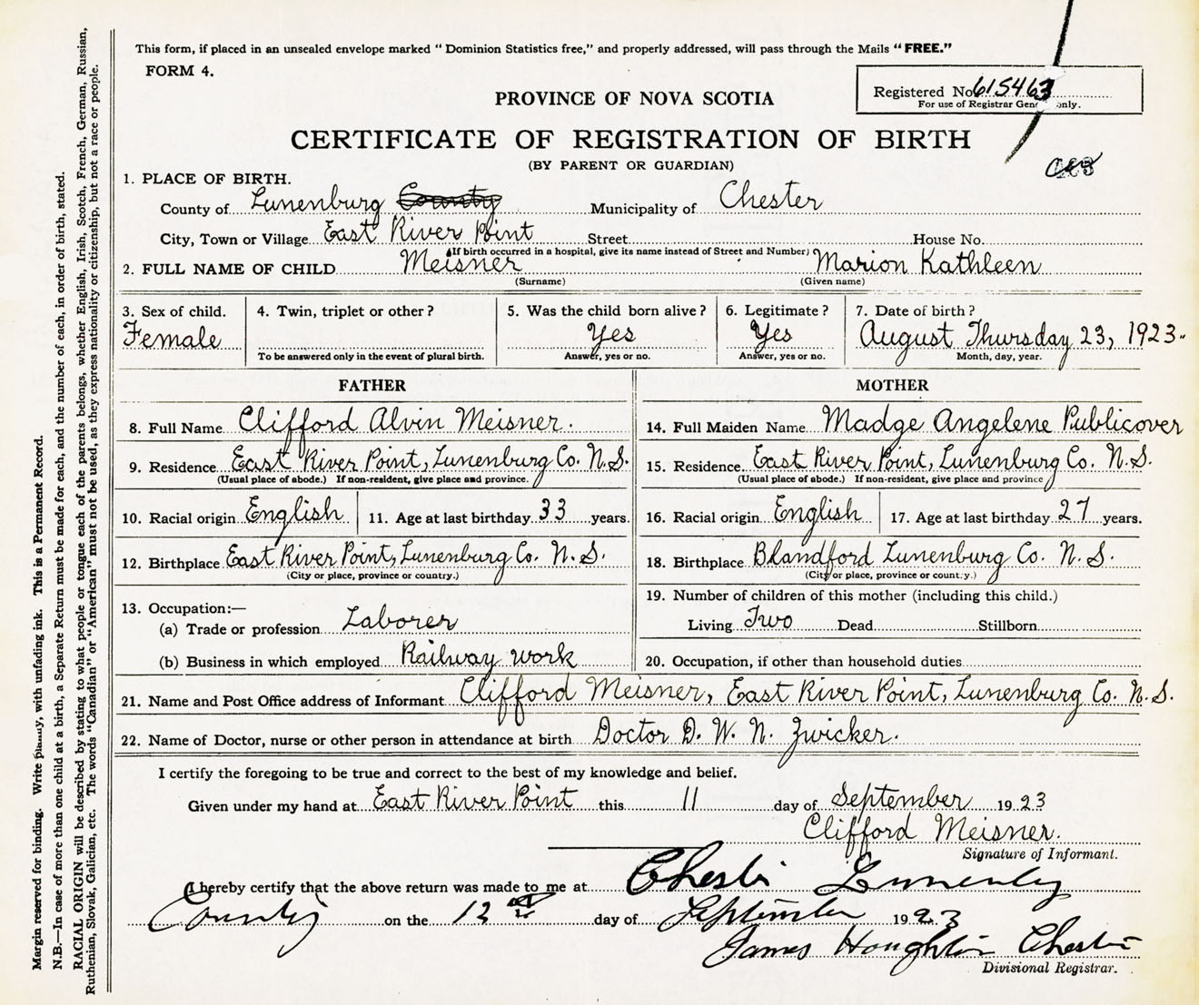 Female Birth Registration: Year: 1923 number: 61500463