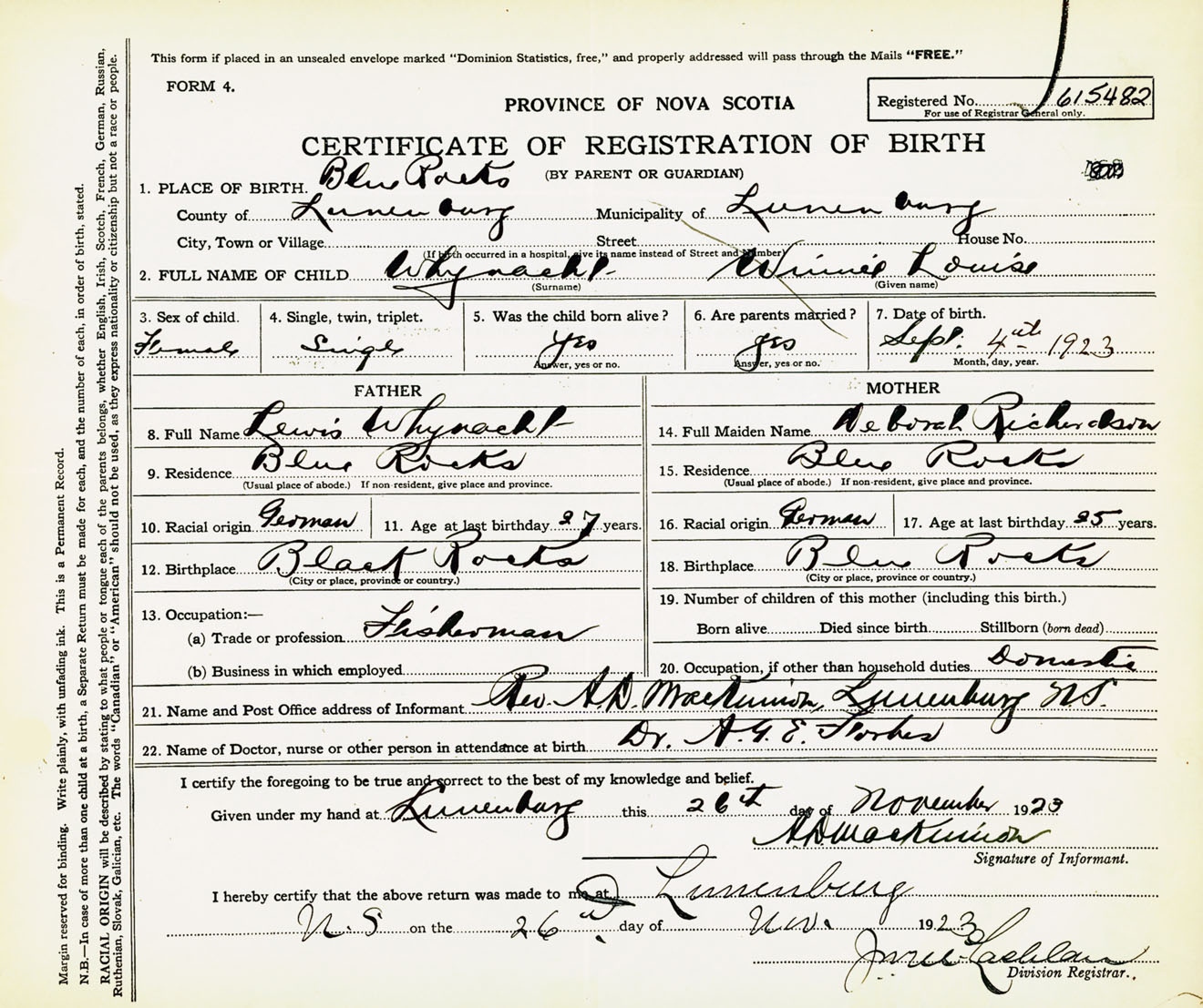 Female Birth Registration: Year: 1923 number: 61500482