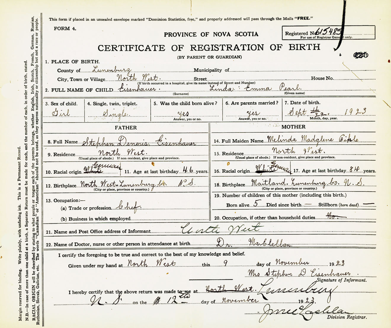 Female Birth Registration: Year: 1923 number: 61500485