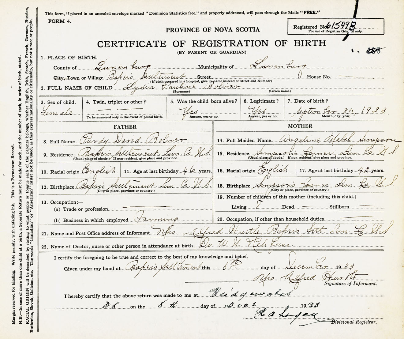 Female Birth Registration: Year: 1923 number: 61500498