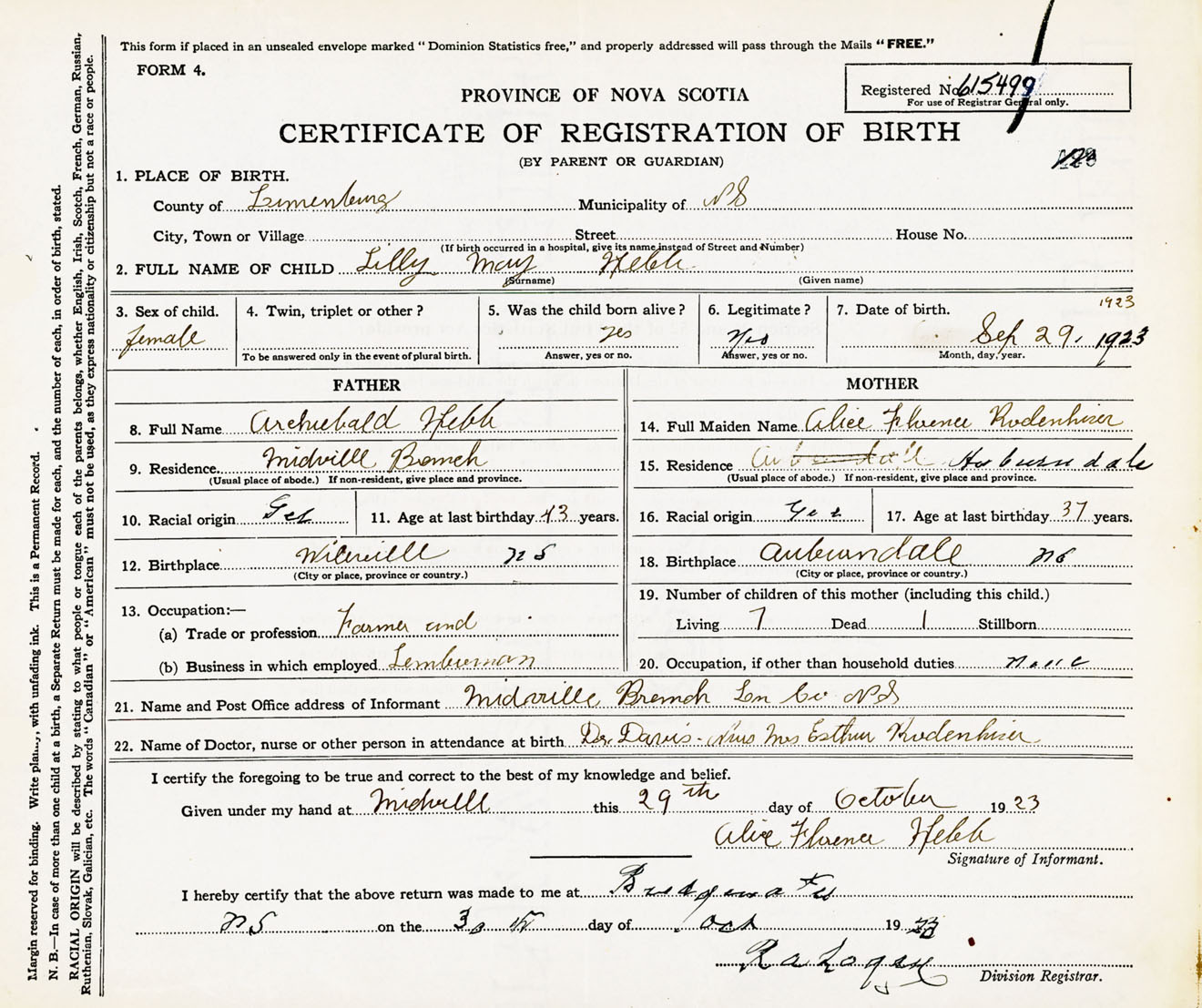 Female Birth Registration: Year: 1923 number: 61500499