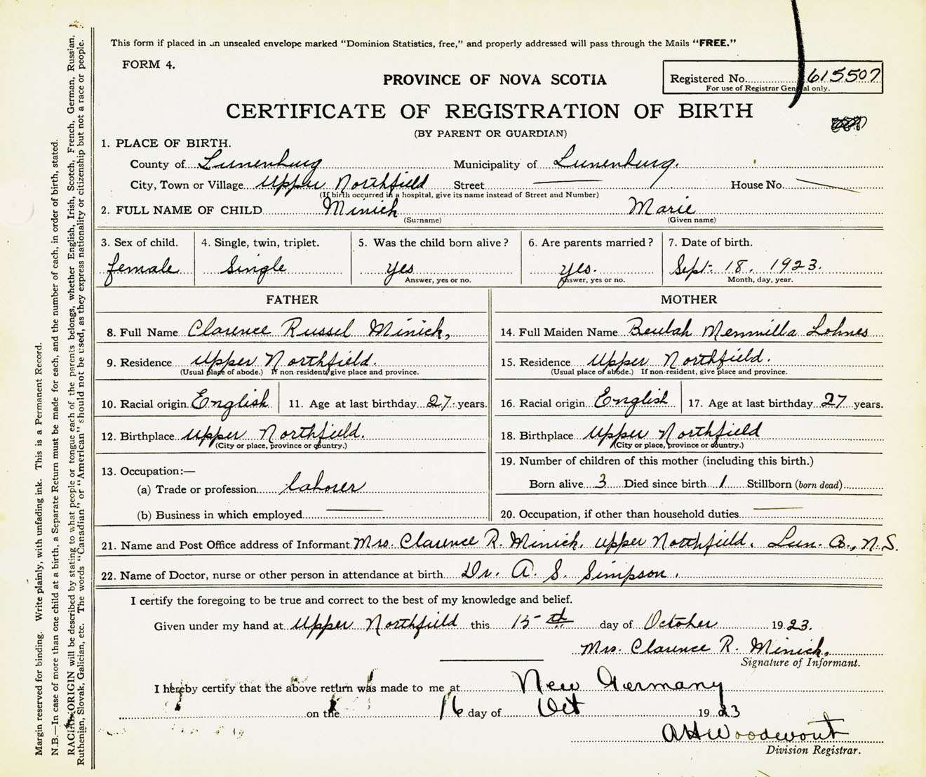 Female Birth Registration: Year: 1923 number: 61500507