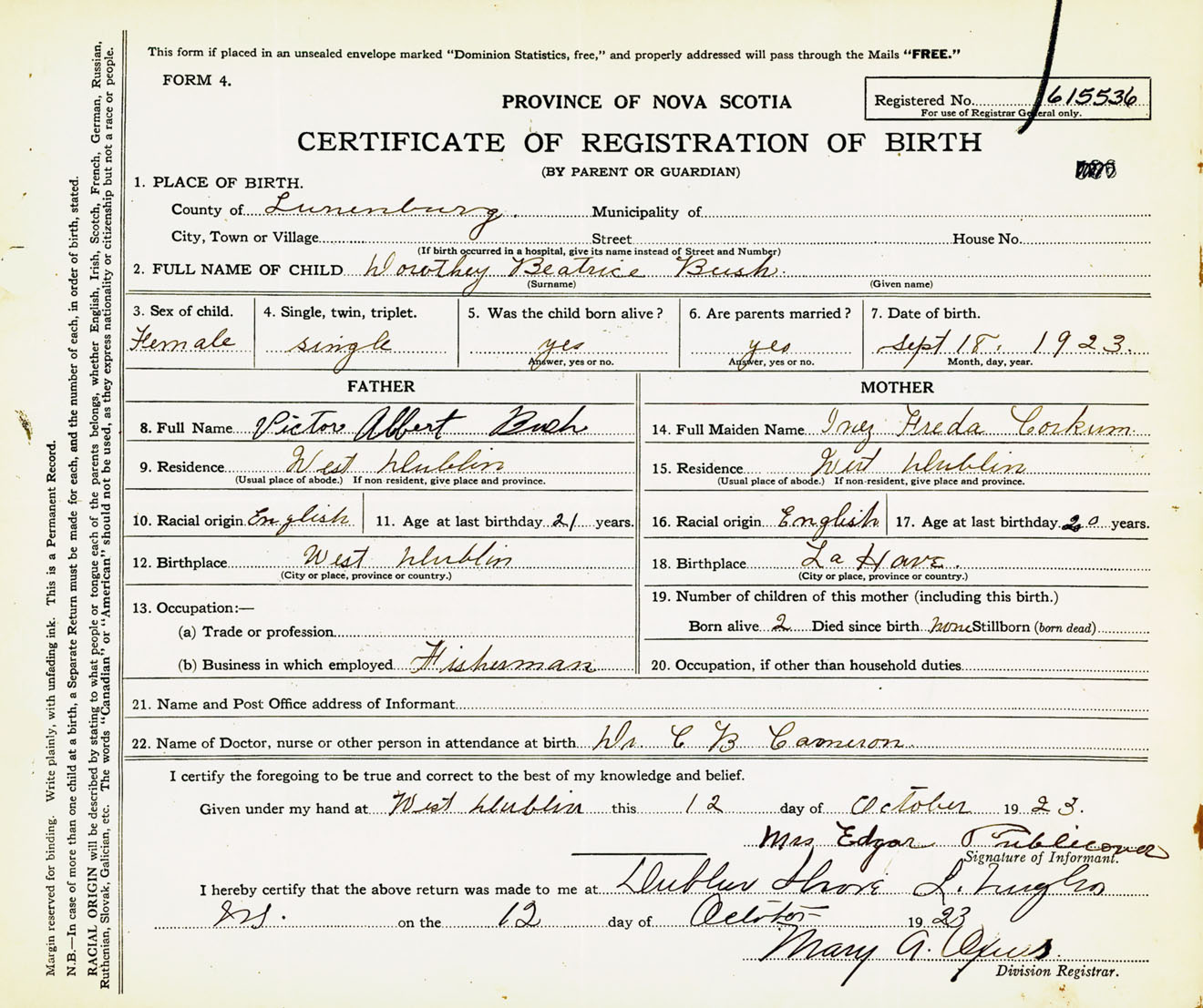 Female Birth Registration: Year: 1923 number: 61500536
