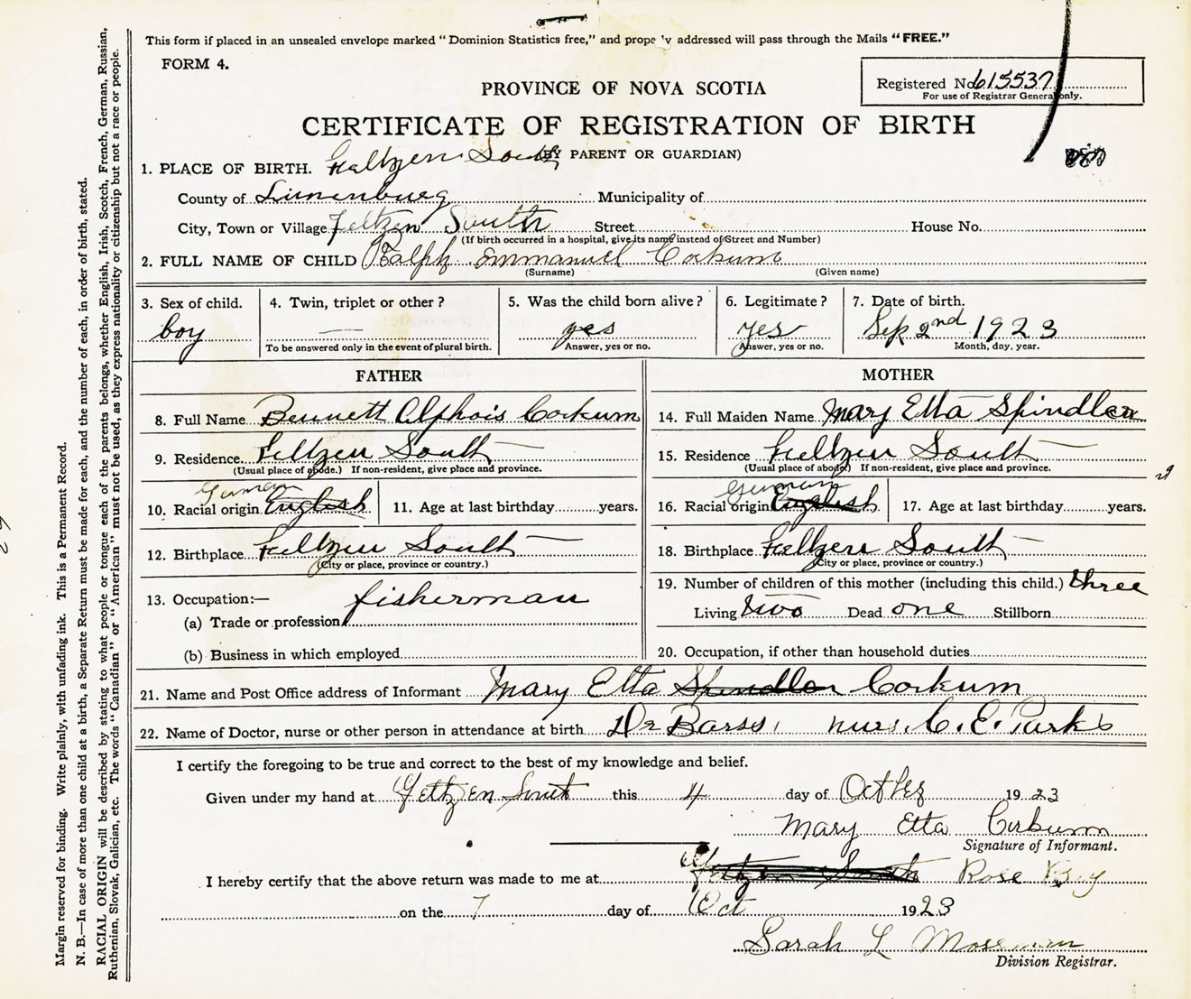 Male Birth Registration: Year: 1923 number: 61500537