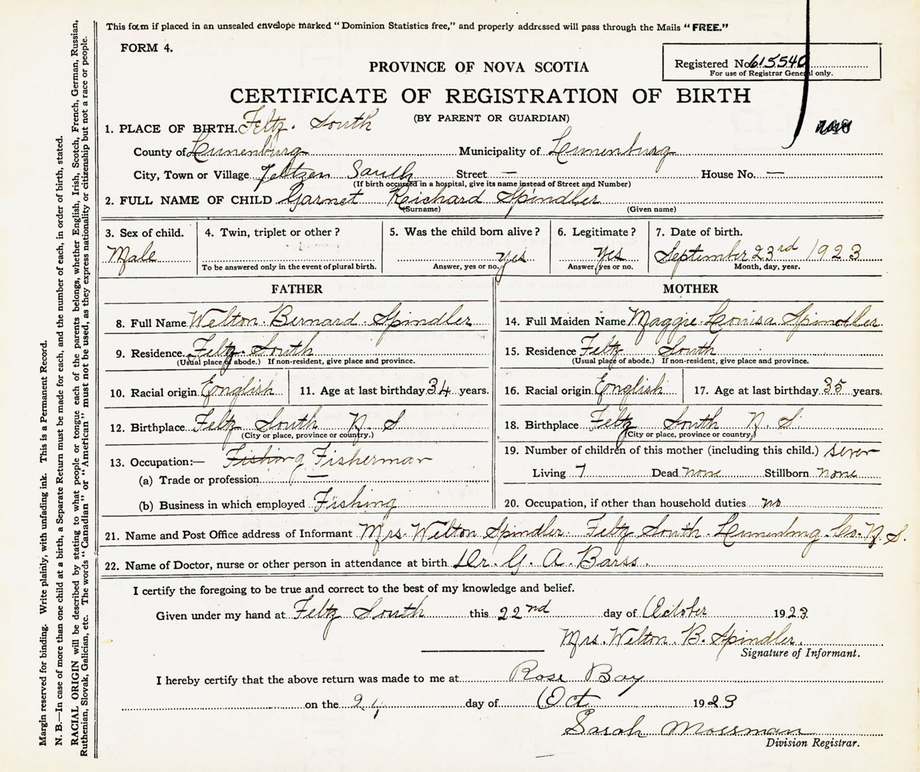 Male Birth Registration: Year: 1923 number: 61500540