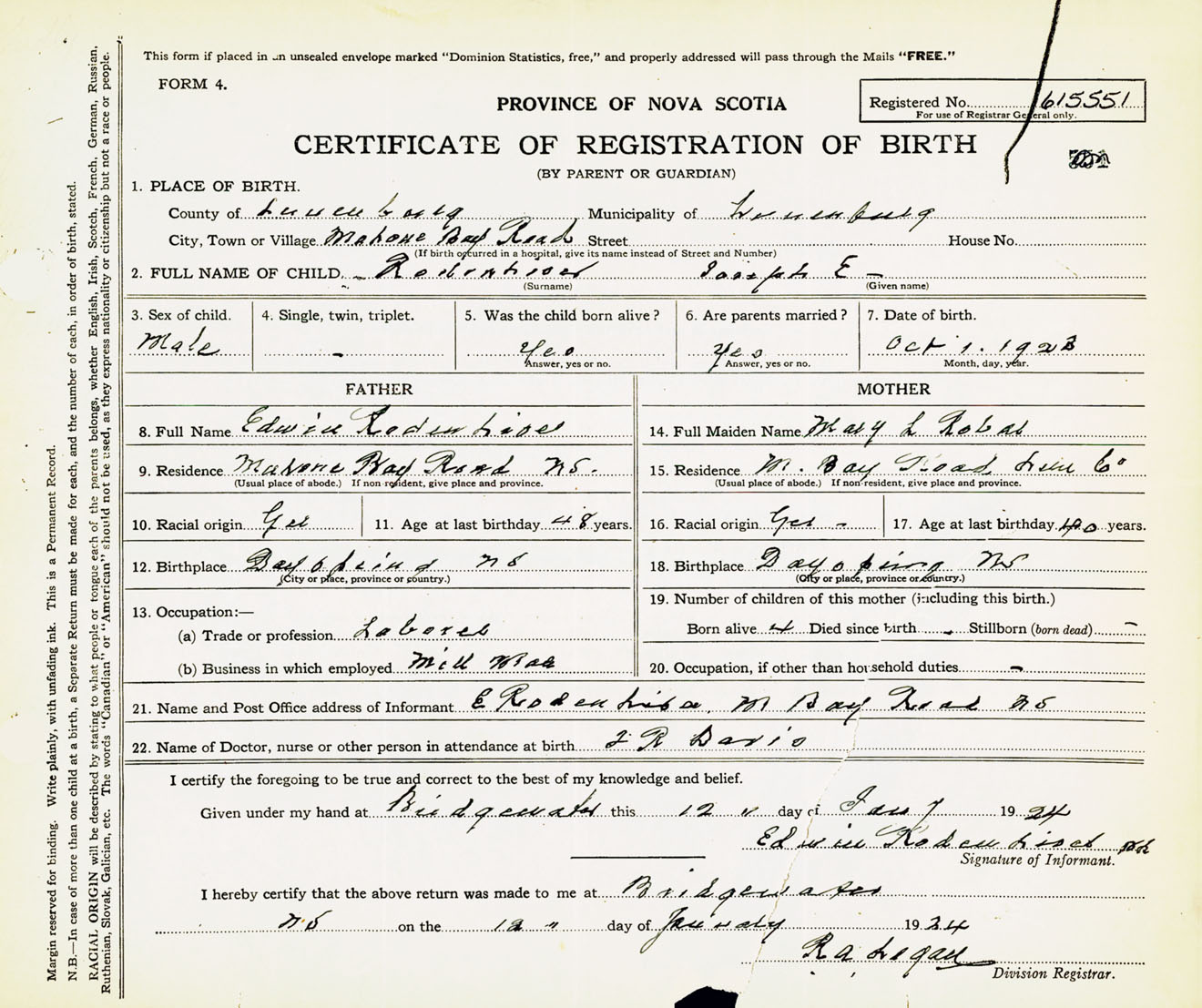 Male Birth Registration: Year: 1923 number: 61500551
