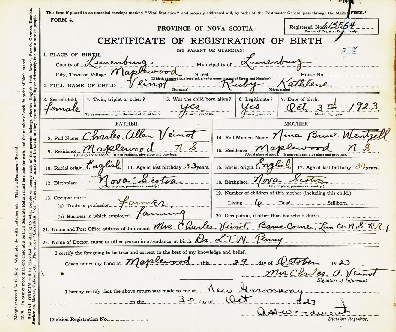 Female Birth Registration: Year: 1923 number: 61500564
