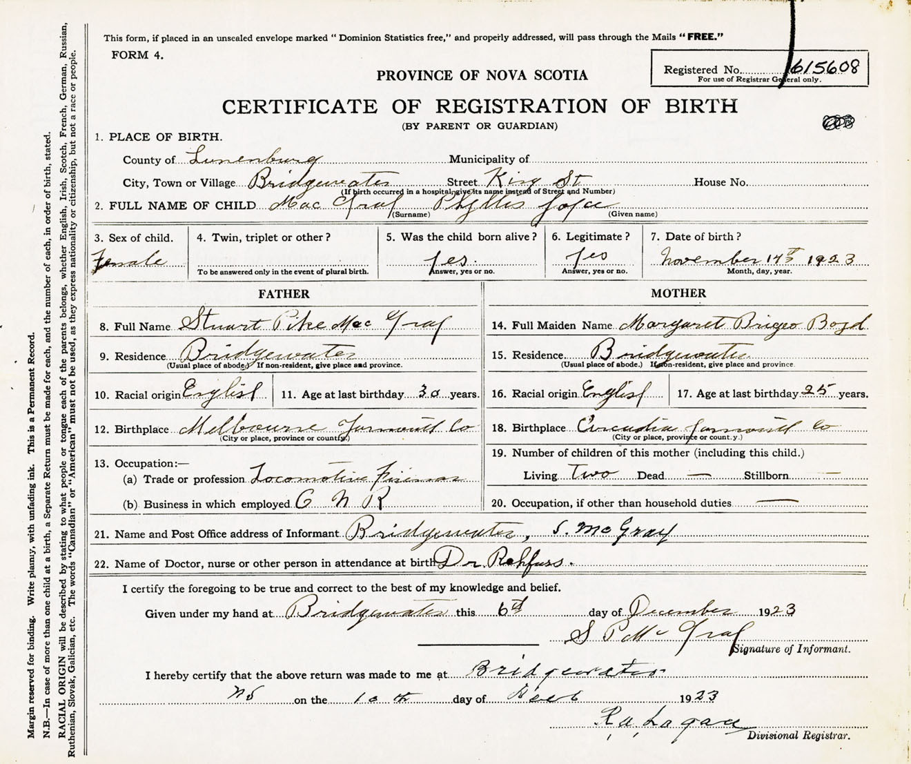 Female Birth Registration: Year: 1923 number: 61500608