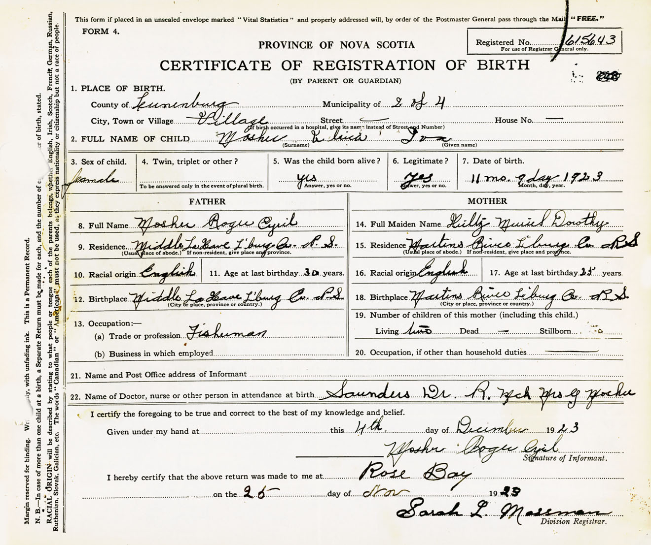 Female Birth Registration: Year: 1923 number: 61500643