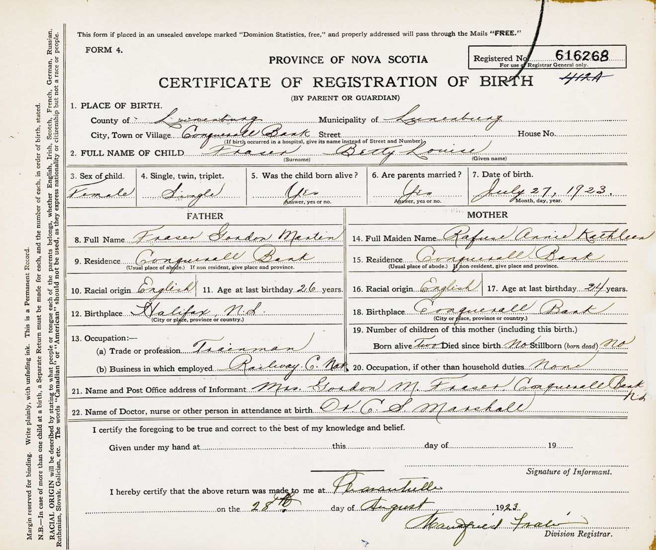 Female Birth Registration: Year: 1923 number: 61600268