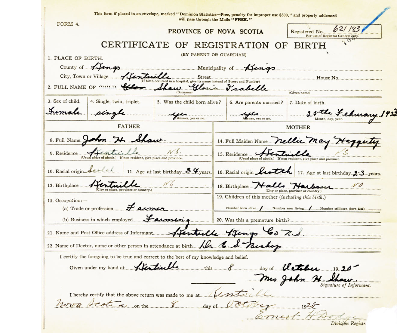 21. Name and Post Office address of Informant Mrs. John H. Shaw Kentville