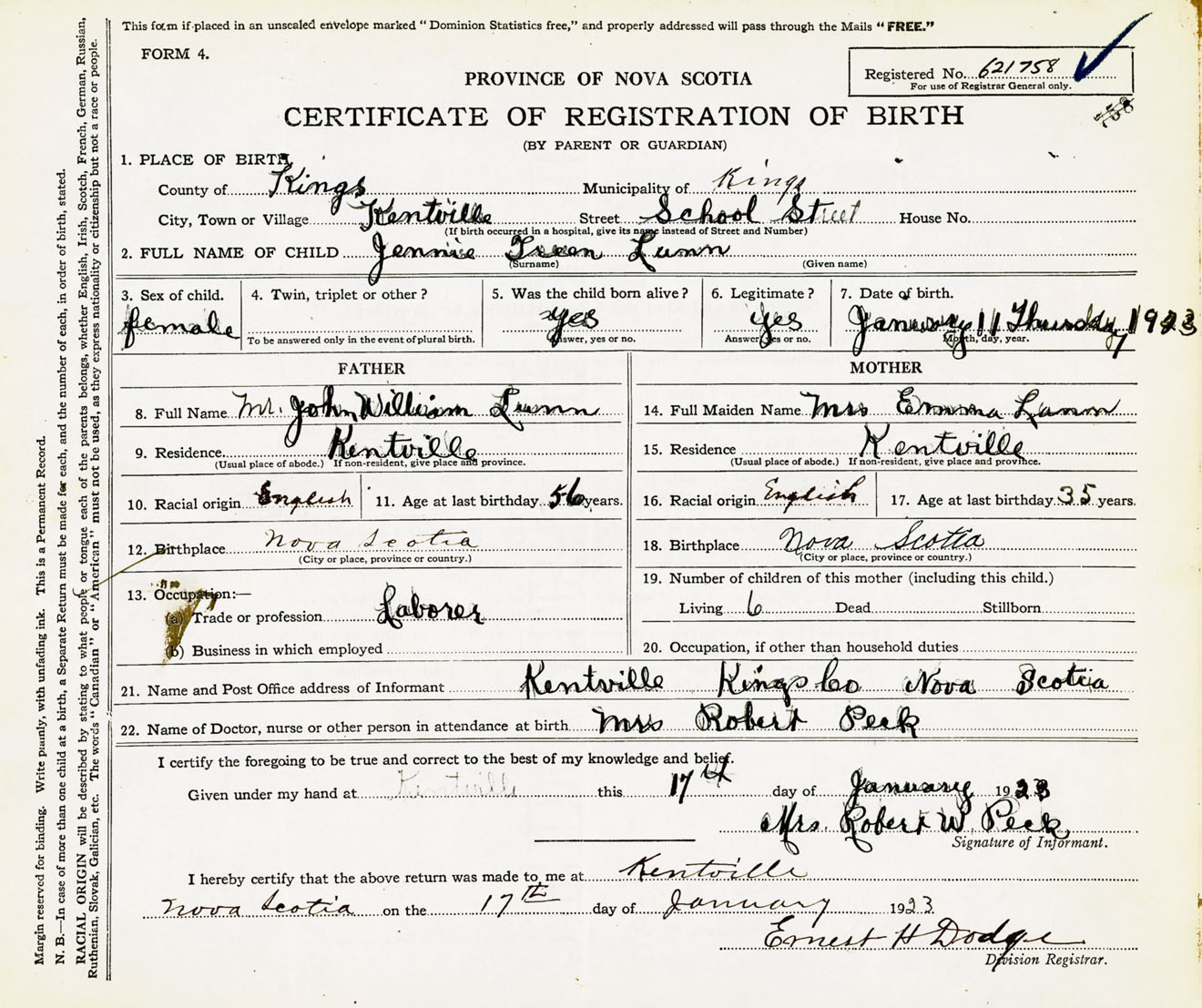 21. Name and Post Office address of Informant Mrs. Robert W. Peck Kentville