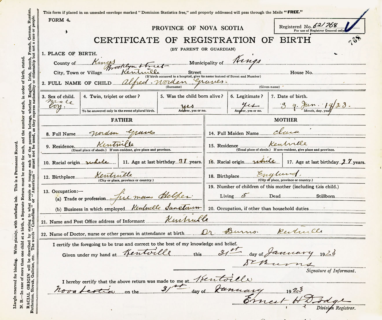 21. Name and Post Office address of Informant Dr. Burns Kentville