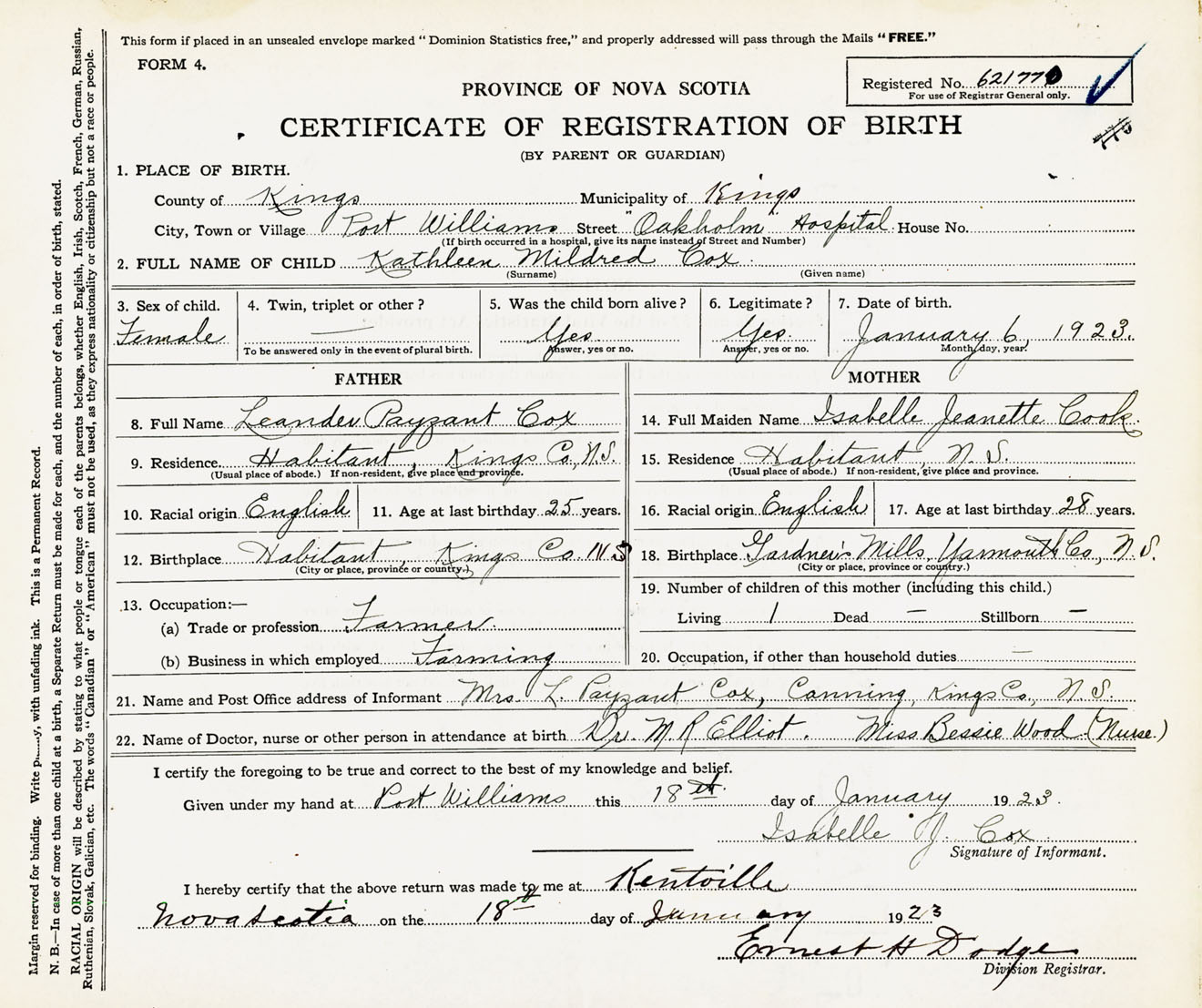 22. Name of Doctor, nurse or other person in attendance at birth Dr. M.R. Elliot, Miss Bessie Wood (Nurse)