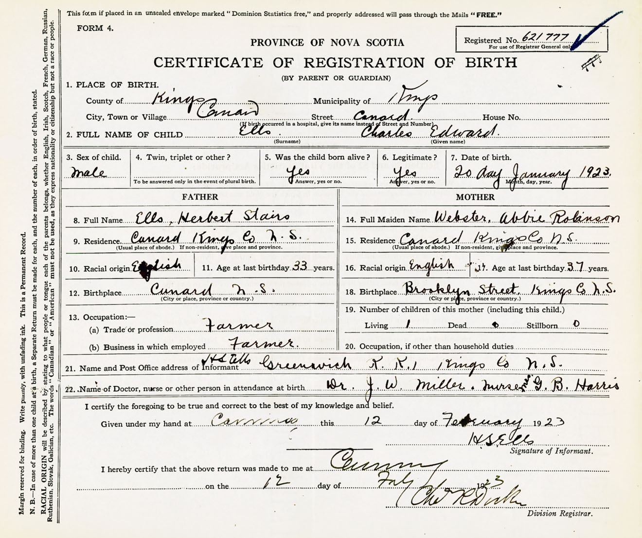 22. Name of Doctor, nurse or other person in attendance at birth Dr. J.W. Miller, Nurse Mrs. G.B. Harris
