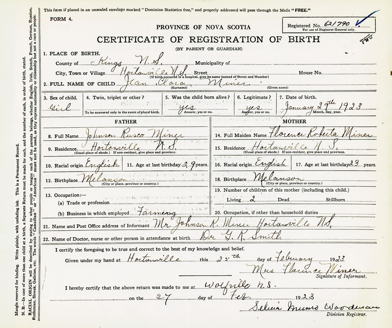 Female Birth Registration: Year: 1923 number: 62100790