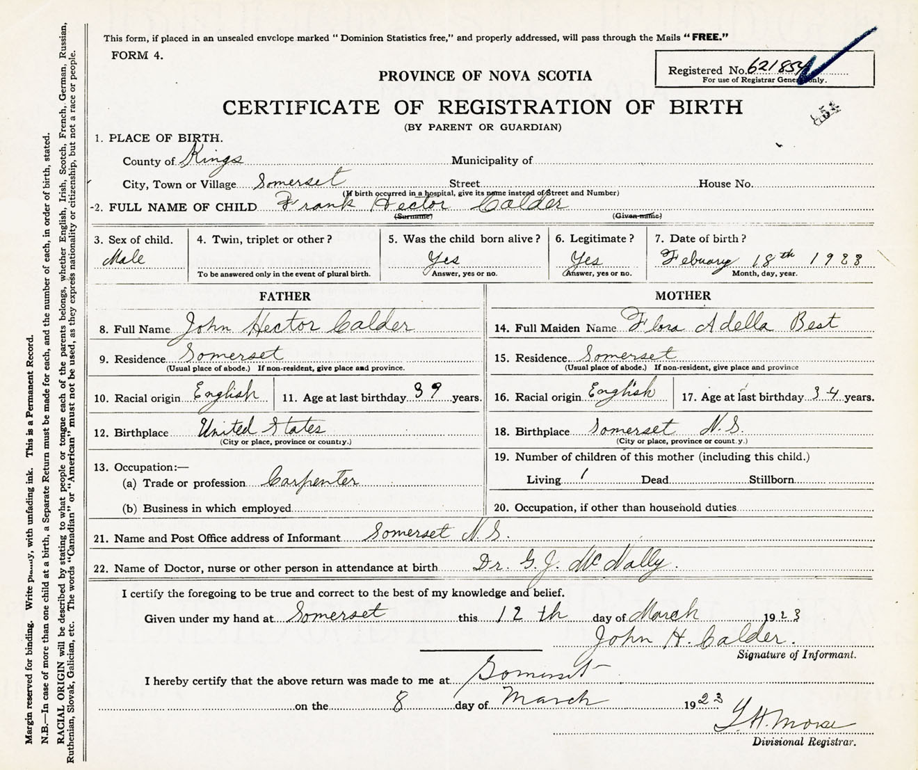 Male Birth Registration: Year: 1923 number: 62100854