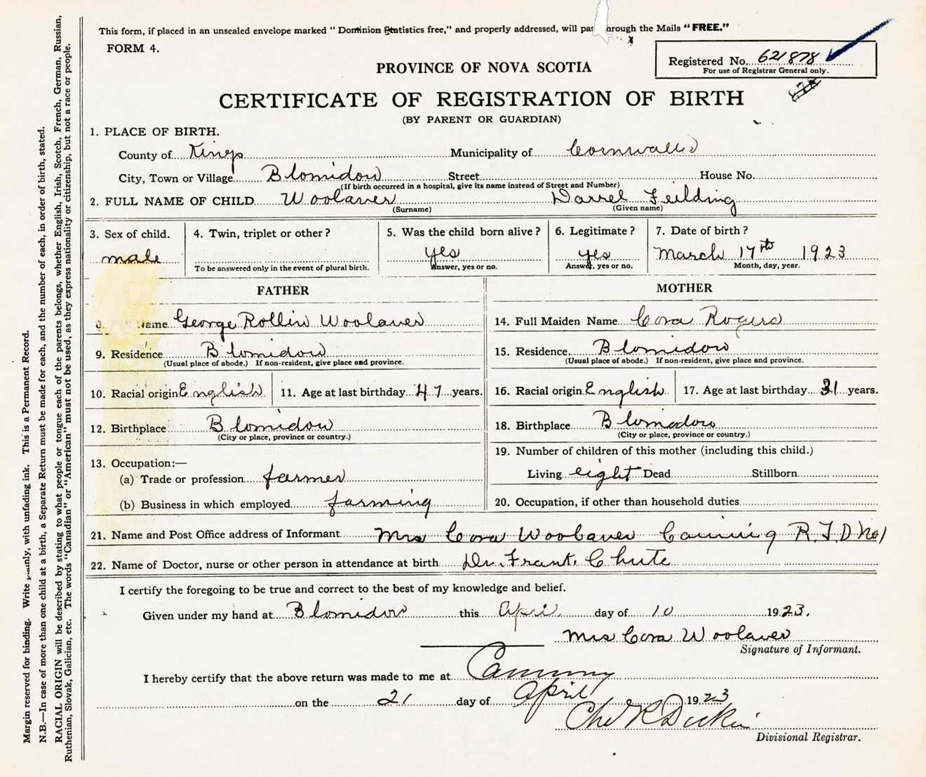 Male Birth Registration: Year: 1923 number: 62100878