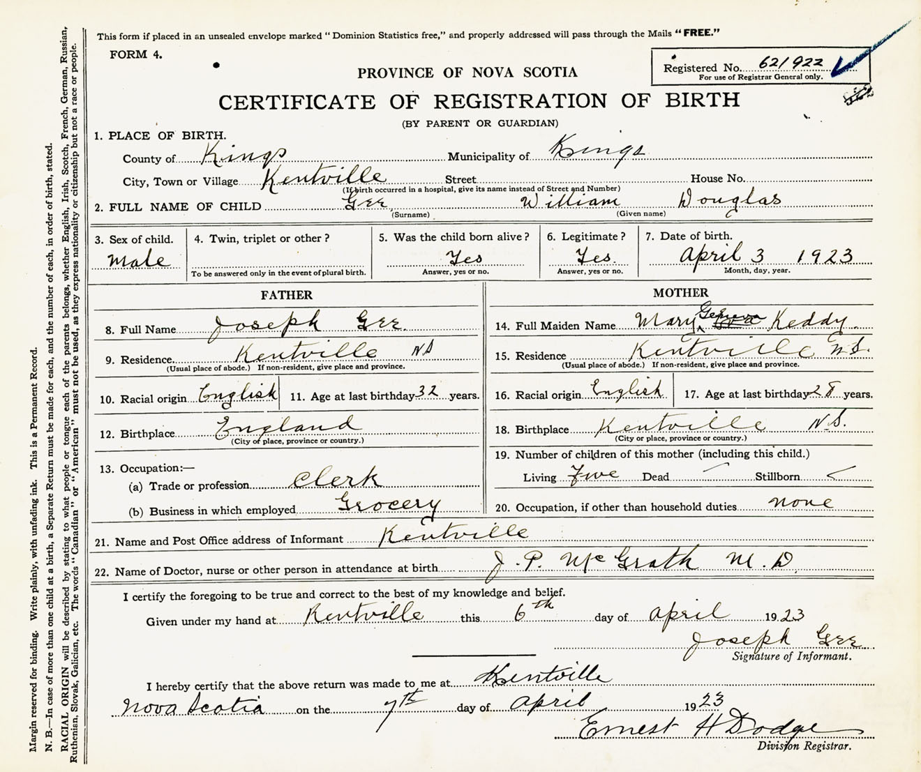Male Birth Registration: Year: 1923 number: 62100922