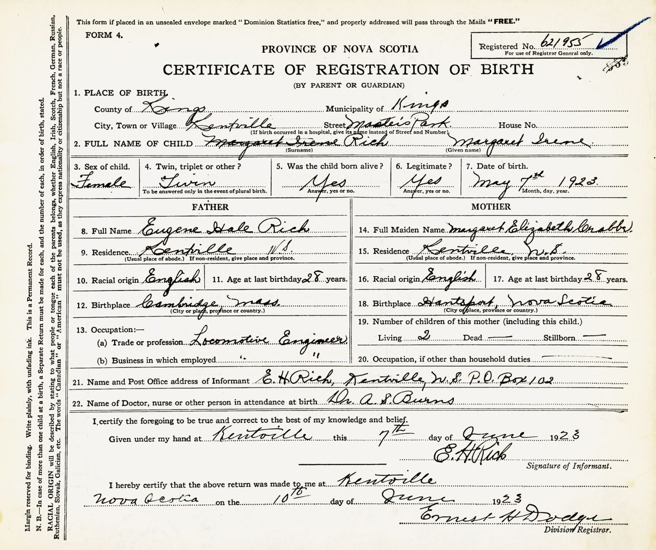 Female Birth Registration: Year: 1923 number: 62100955