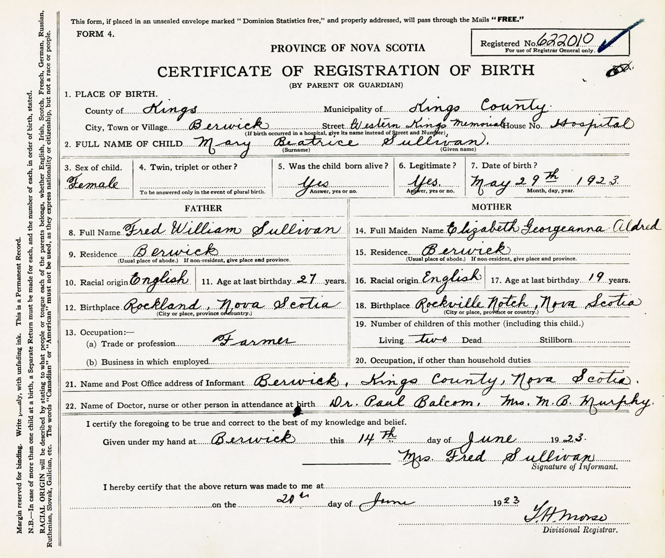 Female Birth Registration: Year: 1923 number: 62200010