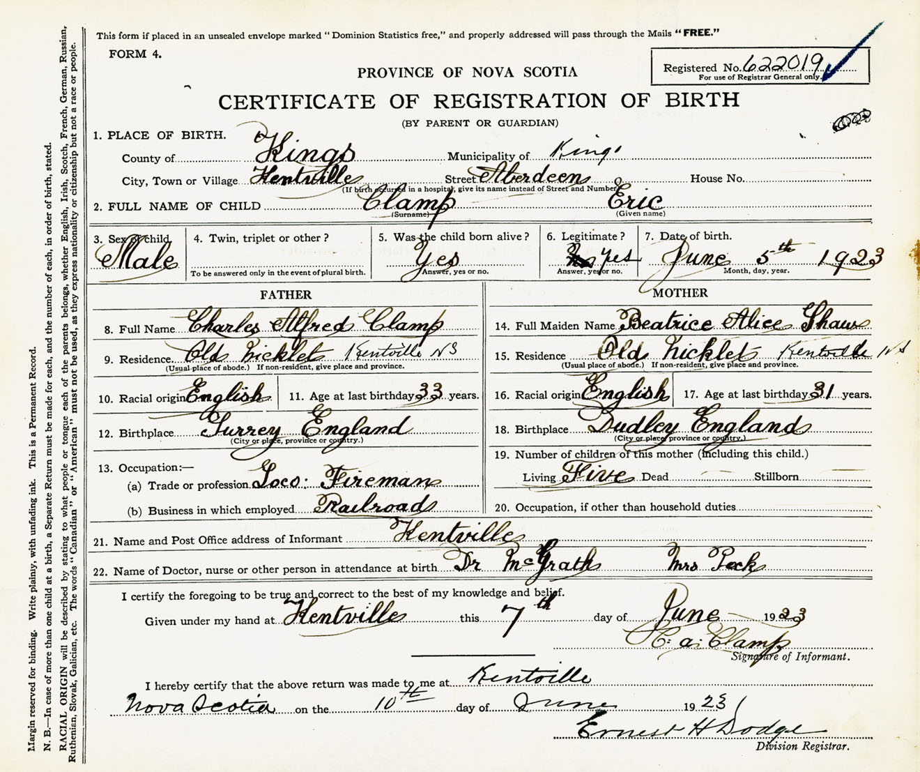 Male Birth Registration: Year: 1923 number: 62200019