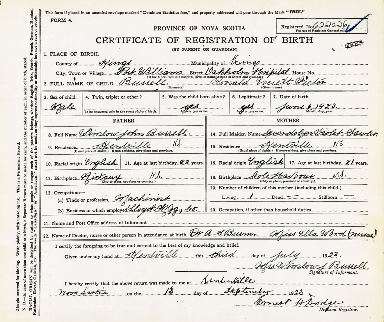 Male Birth Registration: Year: 1923 number: 62200026