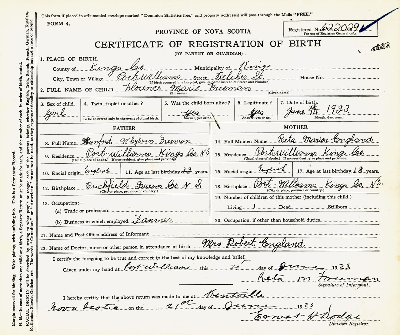 Female Birth Registration: Year: 1923 number: 62200029