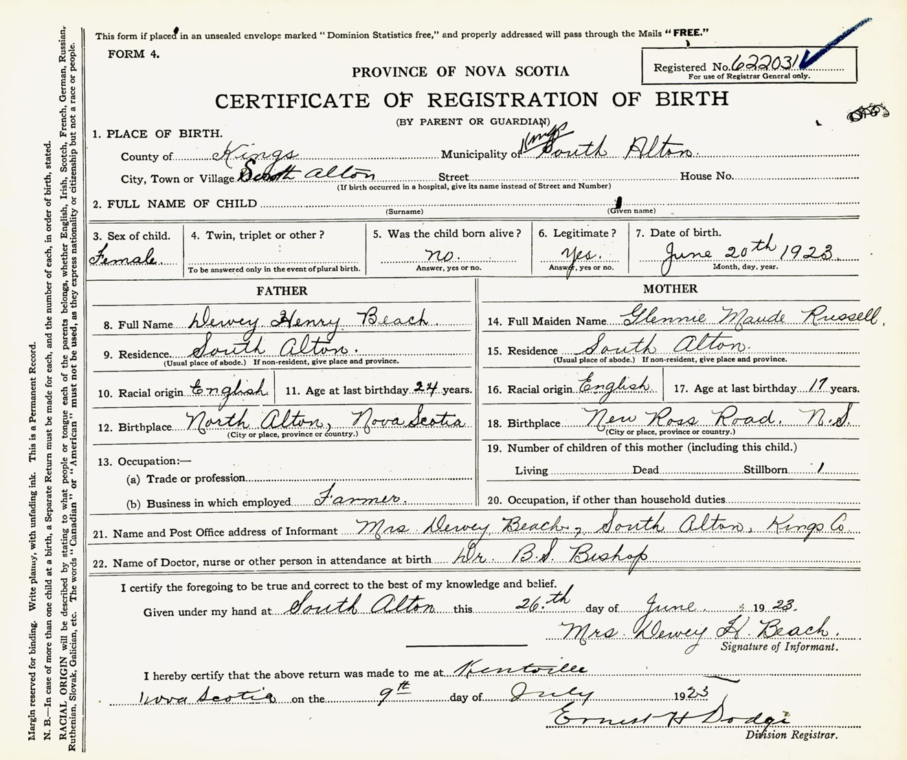 Female Birth Registration: Year: 1923 number: 62200031