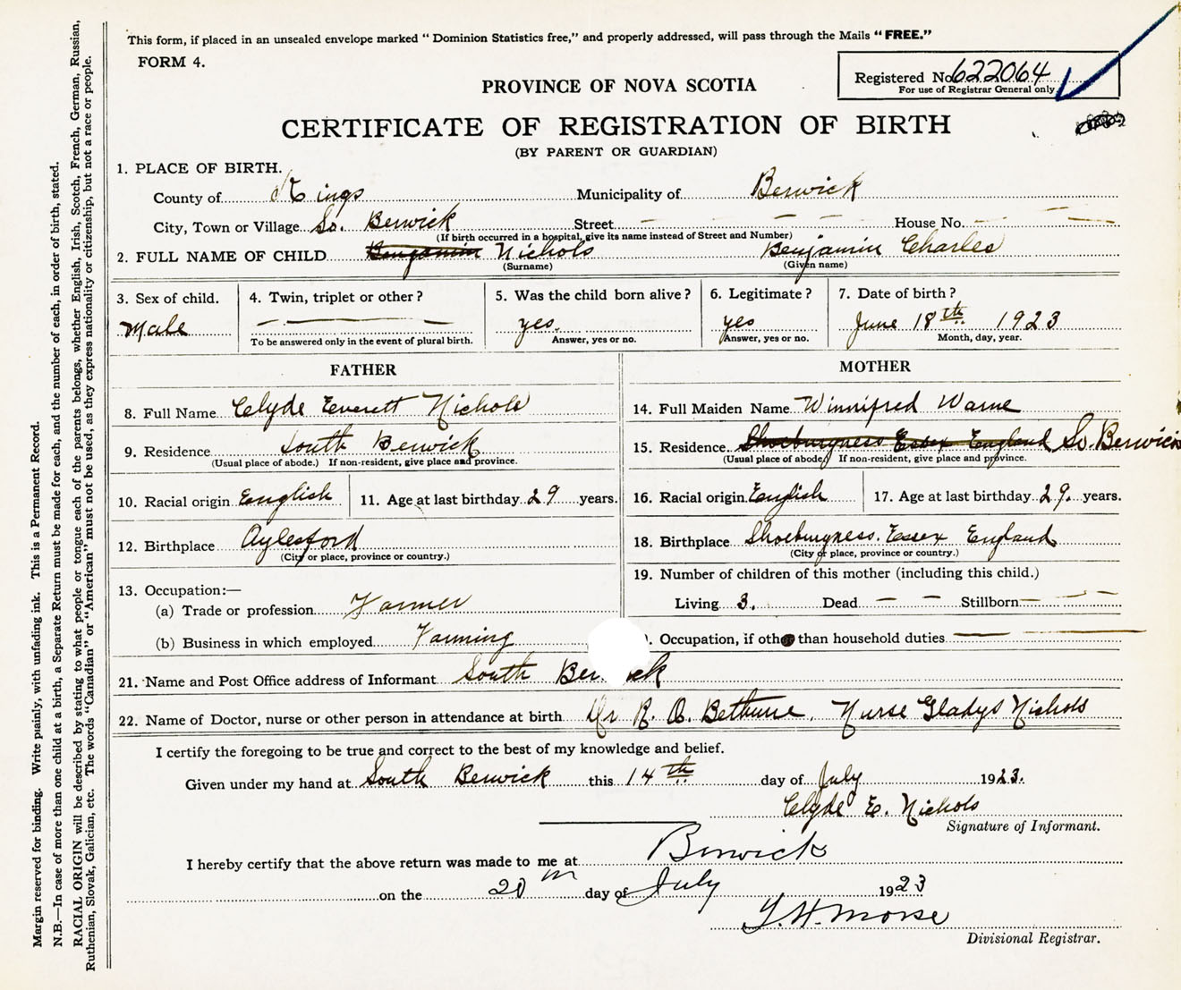 Male Birth Registration: Year: 1923 number: 62200064