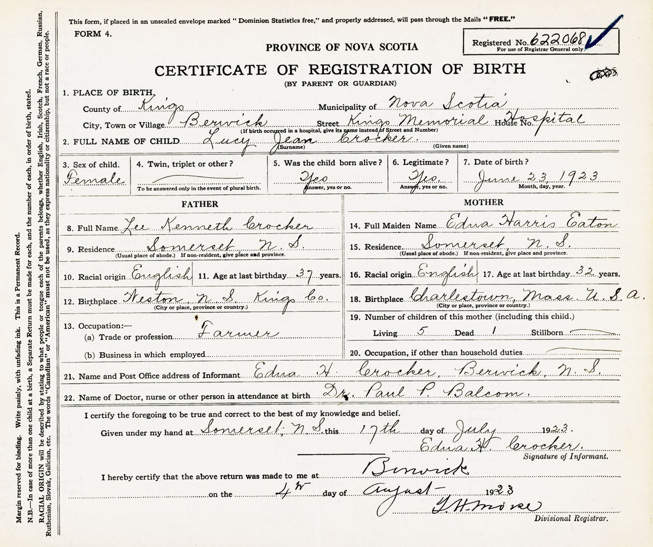Female Birth Registration: Year: 1923 number: 62200068