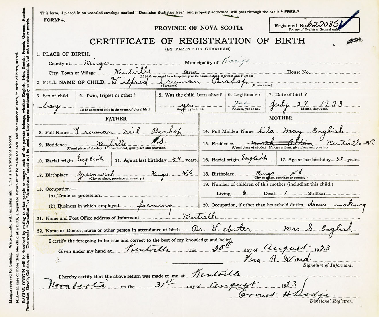 Male Birth Registration: Year: 1923 number: 62200085