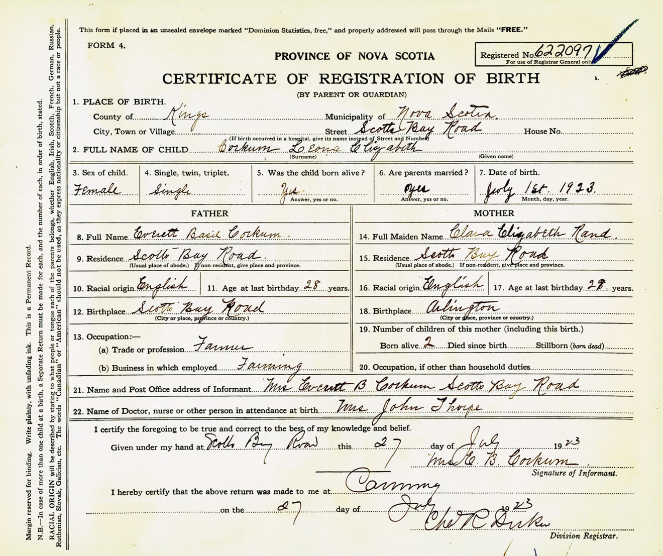 Female Birth Registration: Year: 1923 number: 62200097