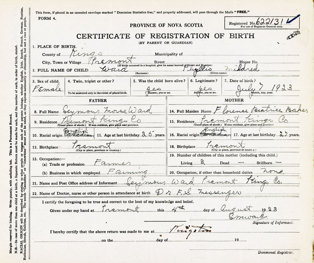 Female Birth Registration: Year: 1923 number: 62200131