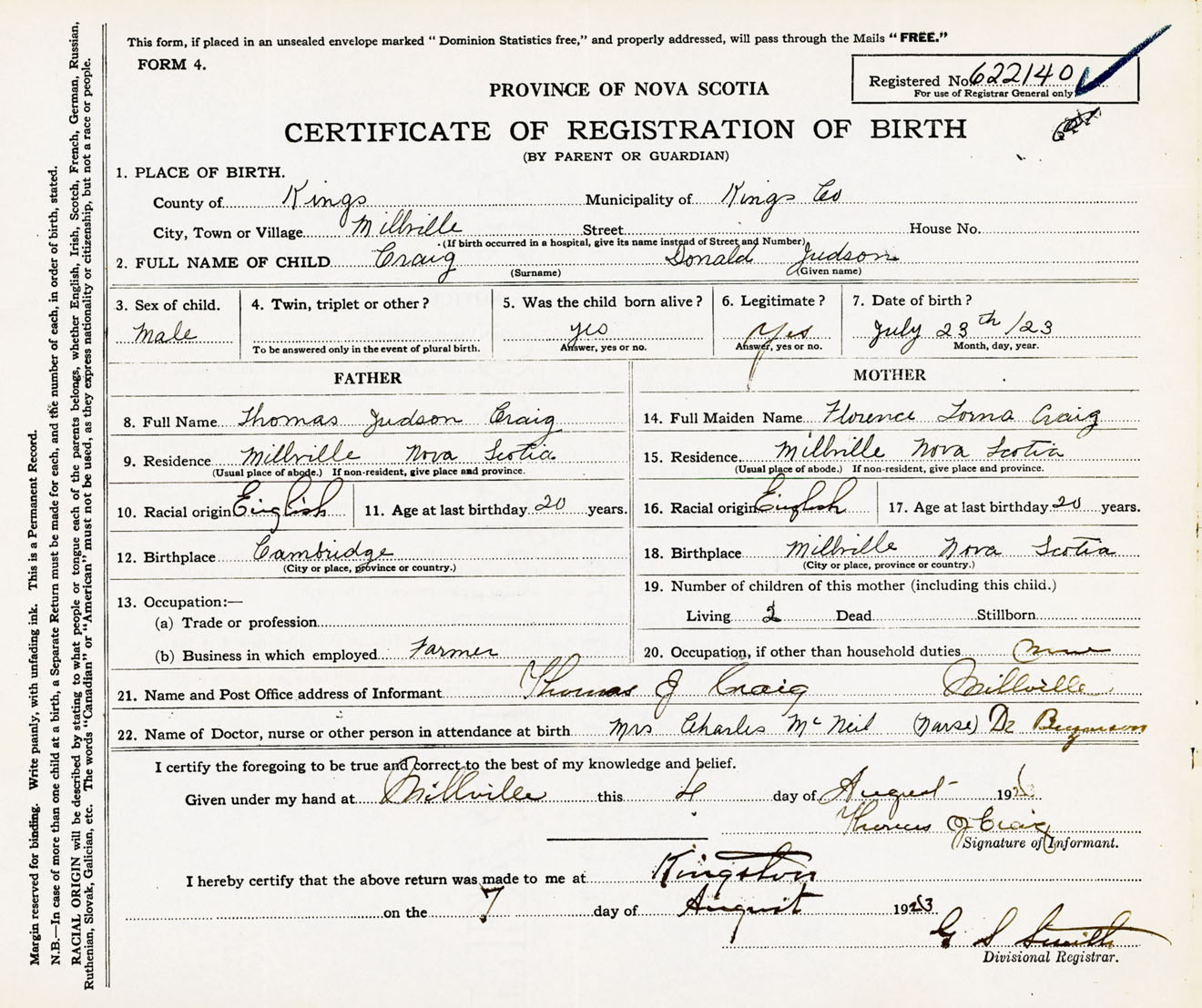 Male Birth Registration: Year: 1923 number: 62200140