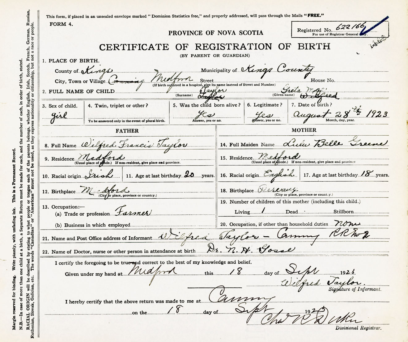 Female Birth Registration: Year: 1923 number: 62200166