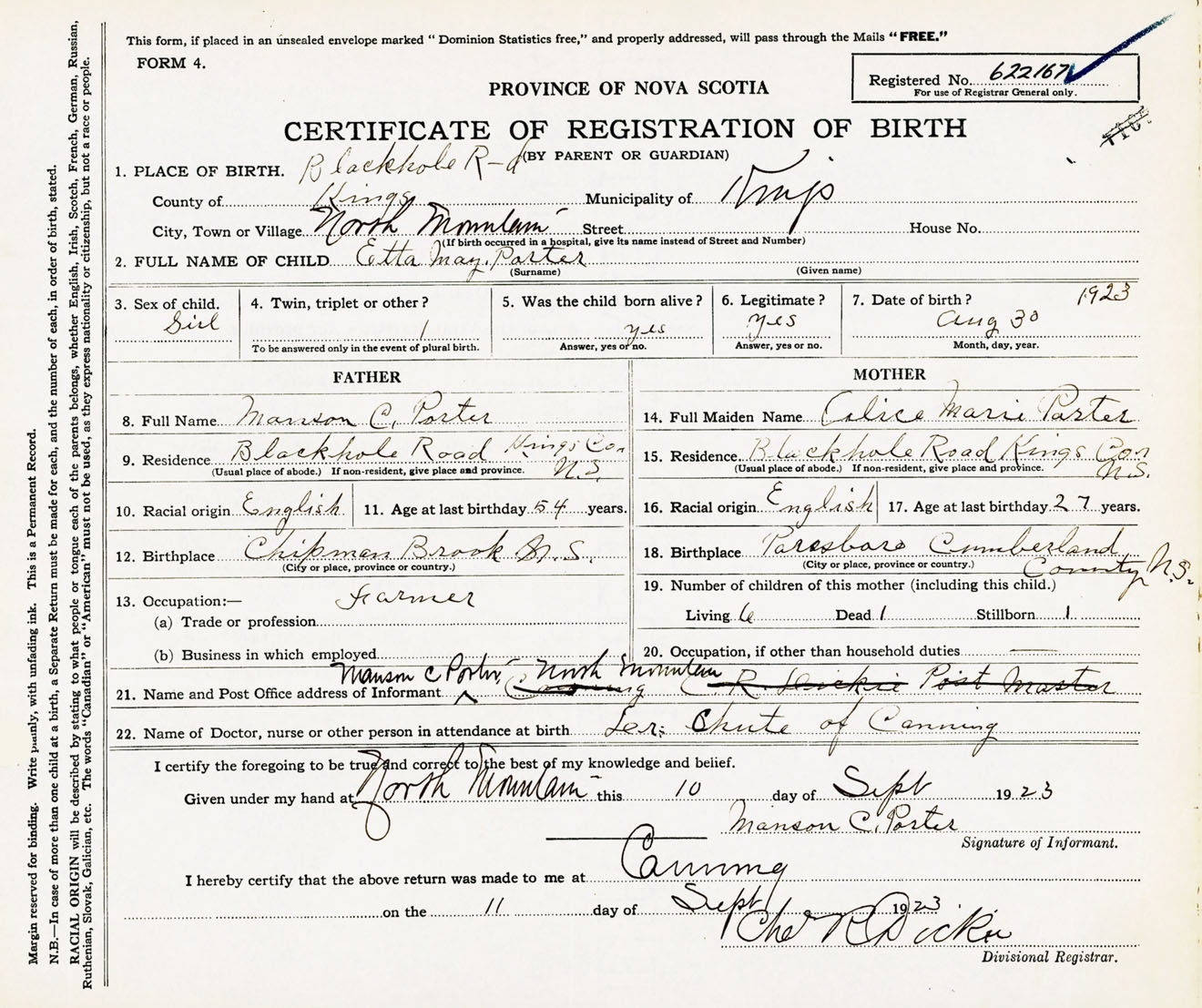 Female Birth Registration: Year: 1923 number: 62200167