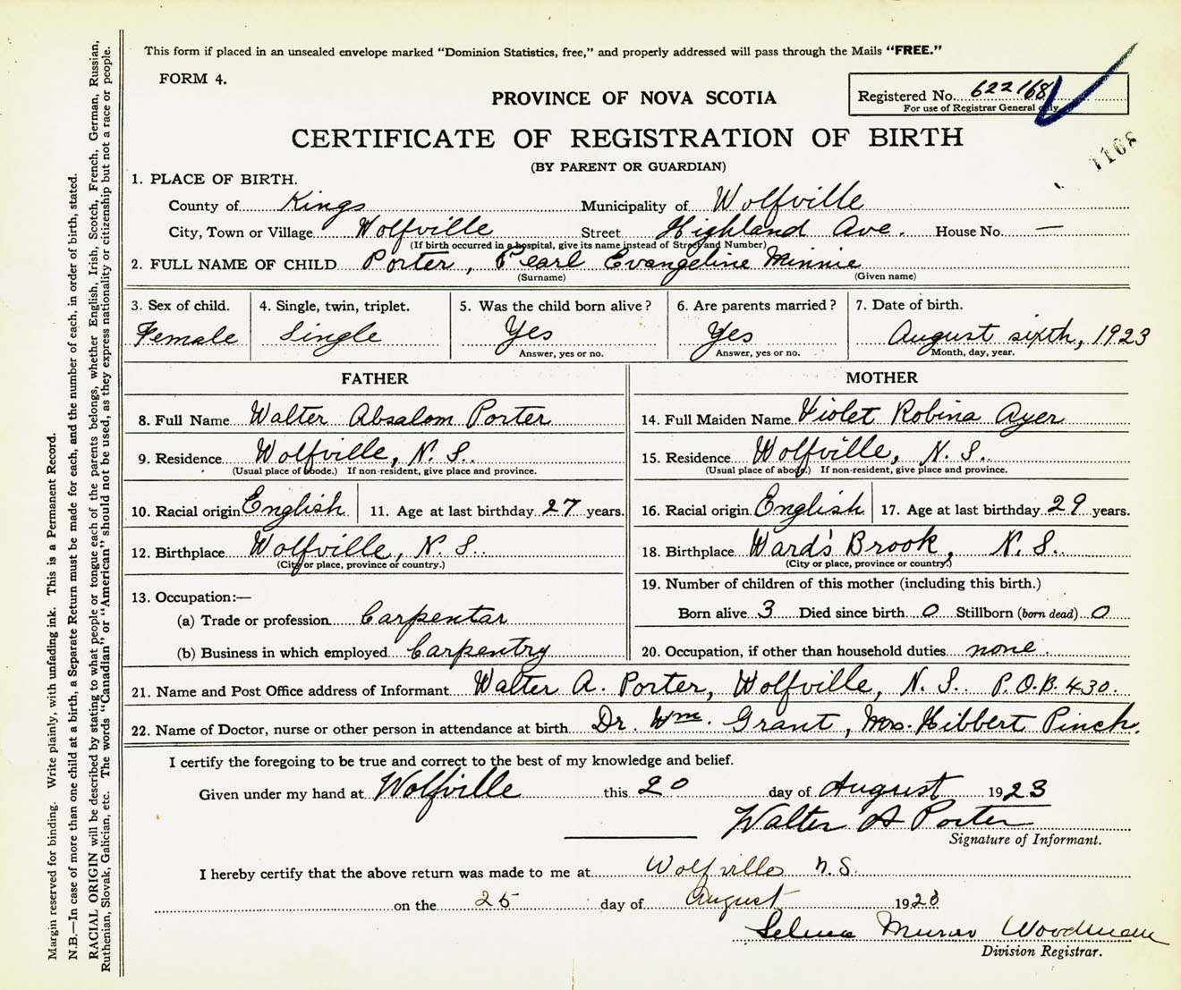 Female Birth Registration: Year: 1923 number: 62200168