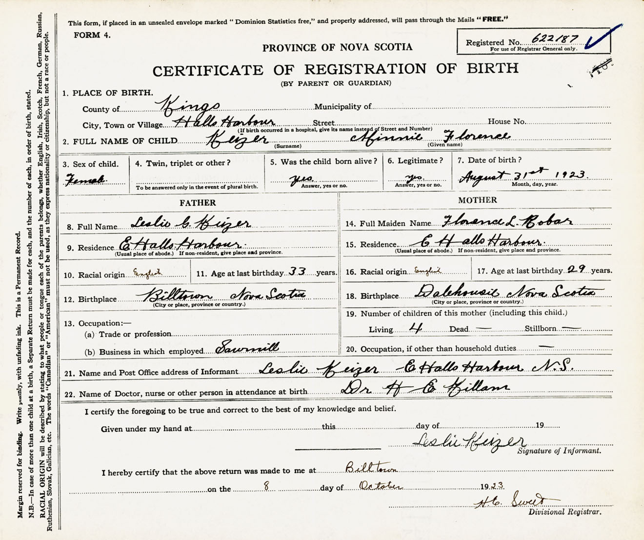 Female Birth Registration: Year: 1923 number: 62200187