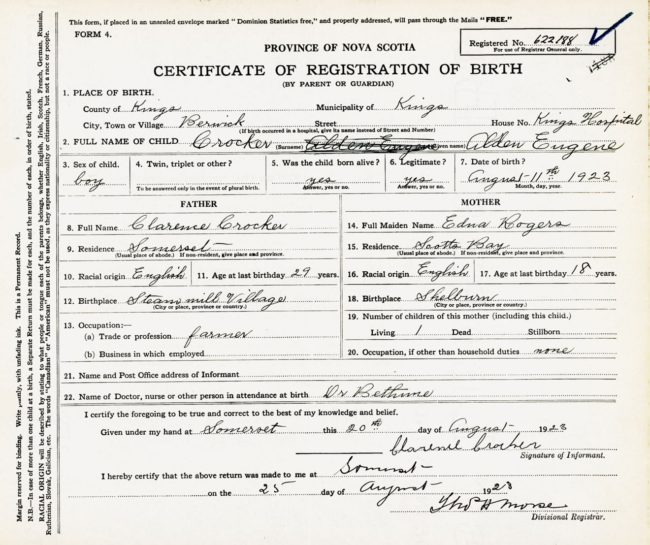 Male Birth Registration: Year: 1923 number: 62200188