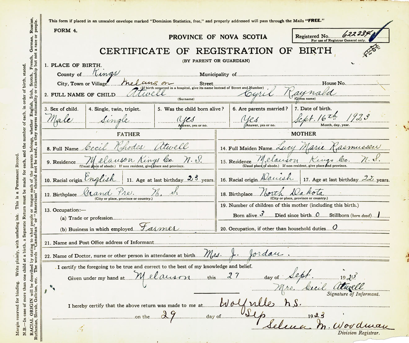 Male Birth Registration: Year: 1923 number: 62200234