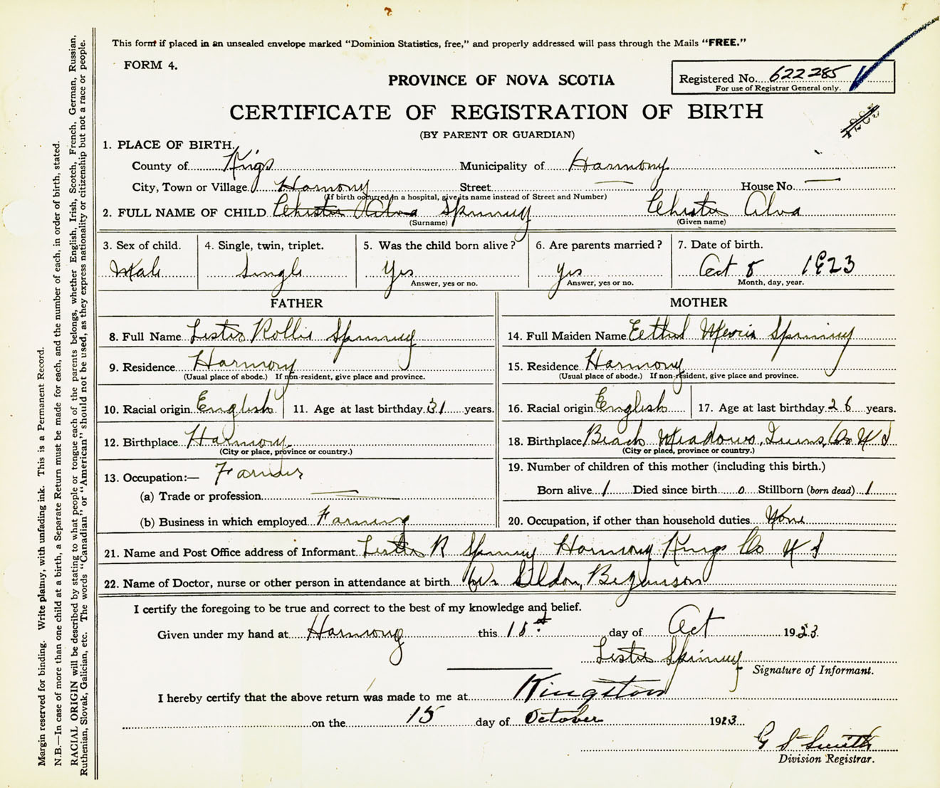 Male Birth Registration: Year: 1923 number: 62200285