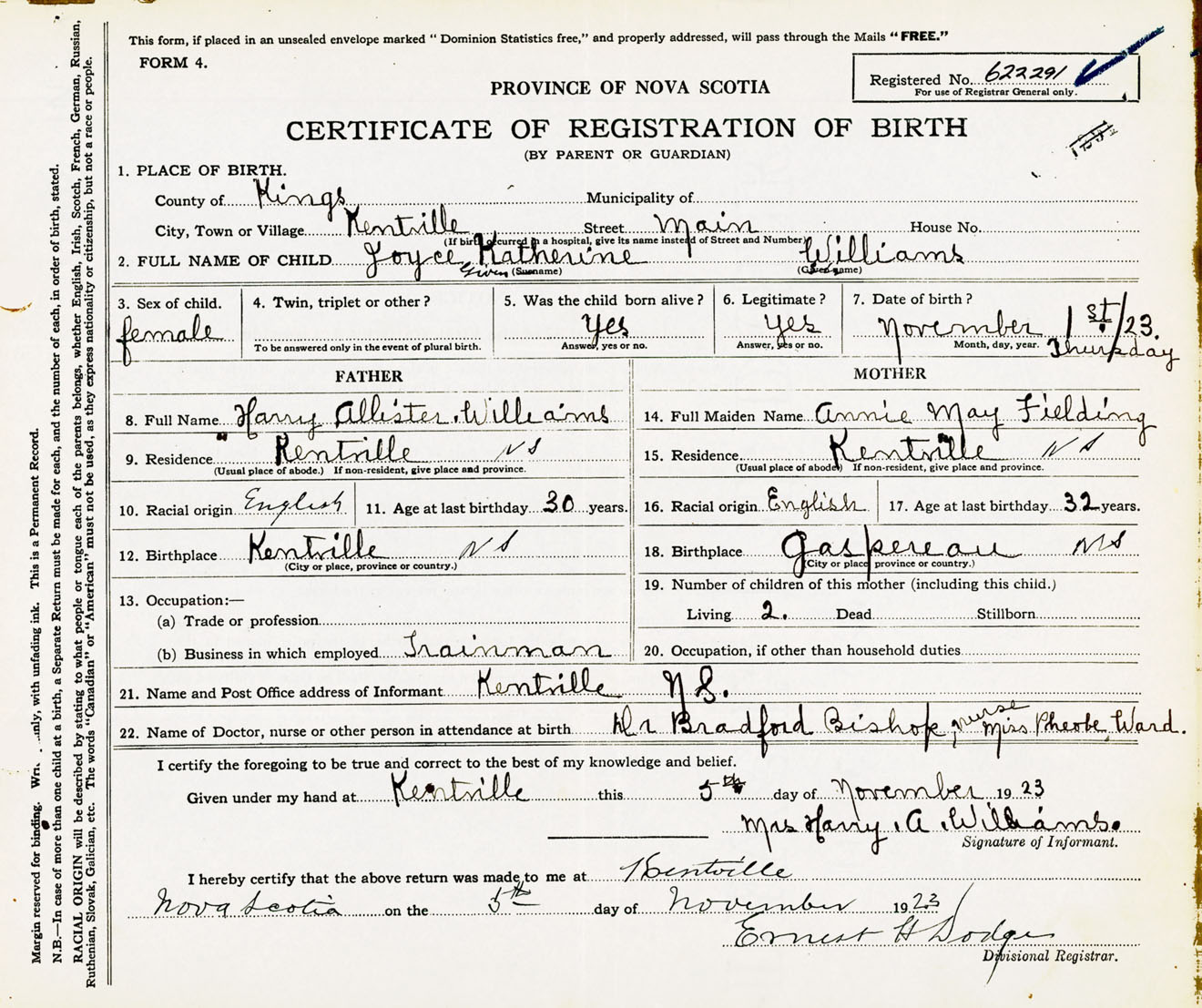 Female Birth Registration: Year: 1923 number: 62200291