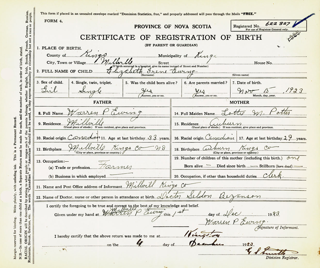Female Birth Registration: Year: 1923 number: 62200327