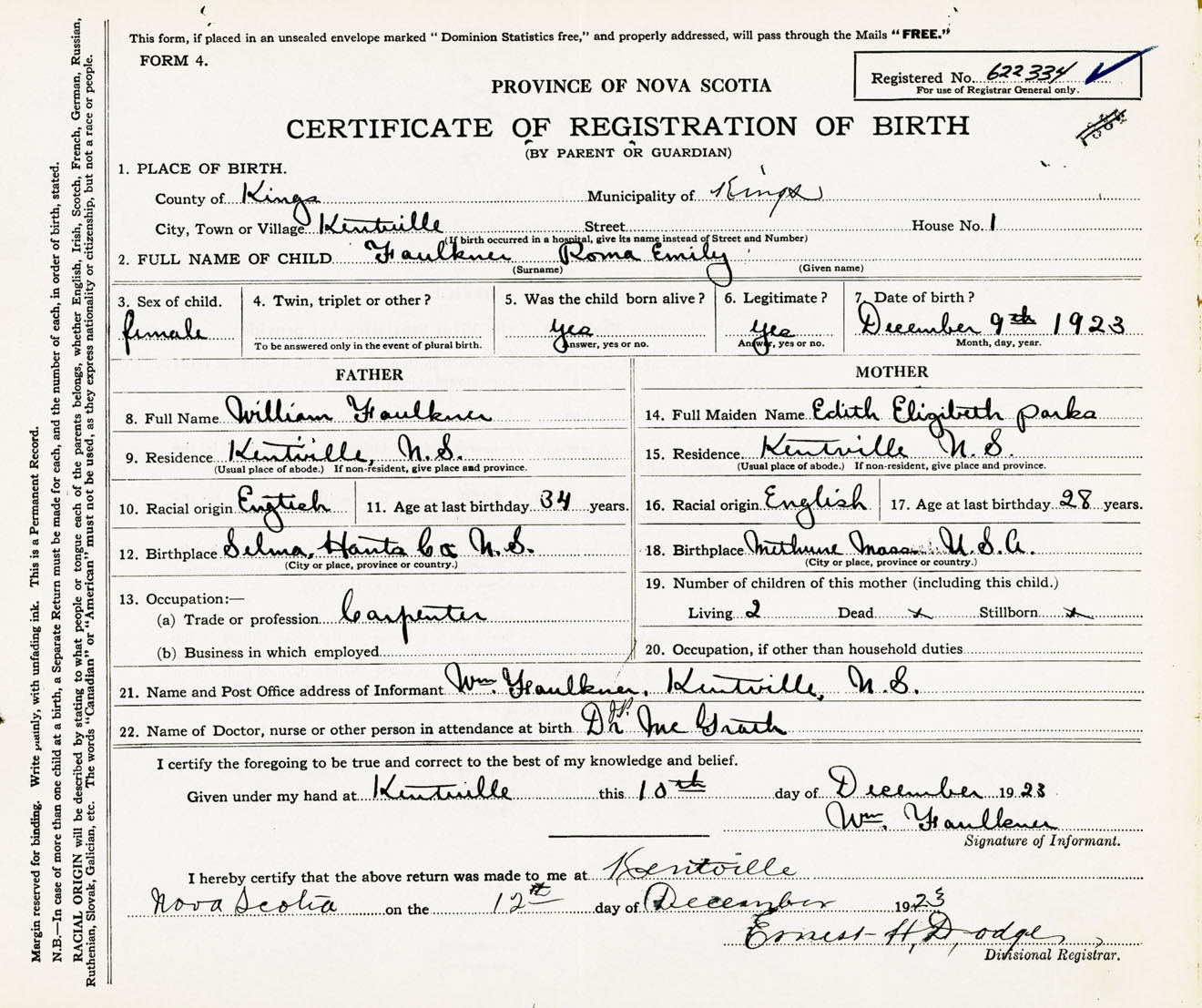 Female Birth Registration: Year: 1923 number: 62200334